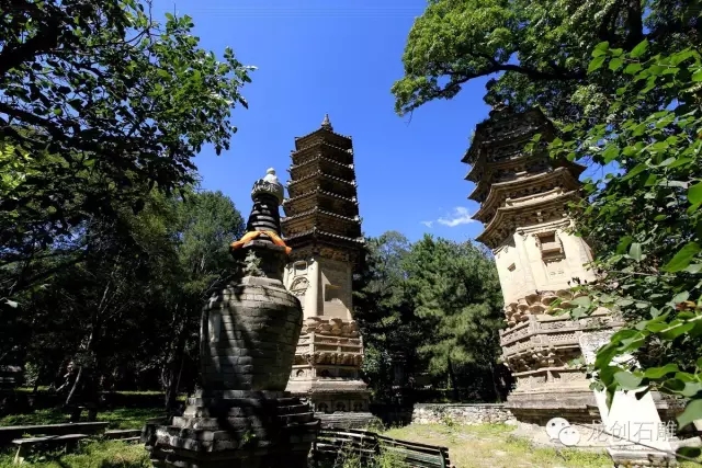潭柘古剎,歷經(jīng)了十多個朝代,規(guī)模宏大,曾有難以數(shù)計的僧人在這里修行,并終老于此,因而在寺院附近留下了數(shù)量眾多的僧人墓塔。如今在寺前的塔林內(nèi)完好的保存著形式多樣的歷代佛塔七十余座。下塔院的塔林埋葬著金、元、明三代的部分高僧,塔形不一,種類較多,有石經(jīng)幢式塔、方形單層浮層屠式塔、密檐式磚塔和覆缽形藏式石塔。塔林中最高大的墓塔要數(shù)金代的廣慧通理禪師塔,此塔位于下塔院的中心,塔高九層,也是密檐式實心磚塔,塔前設有寬大的石供桌,塔前左右兩側(cè)還各有一株千年娑羅樹。