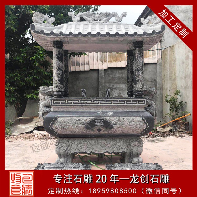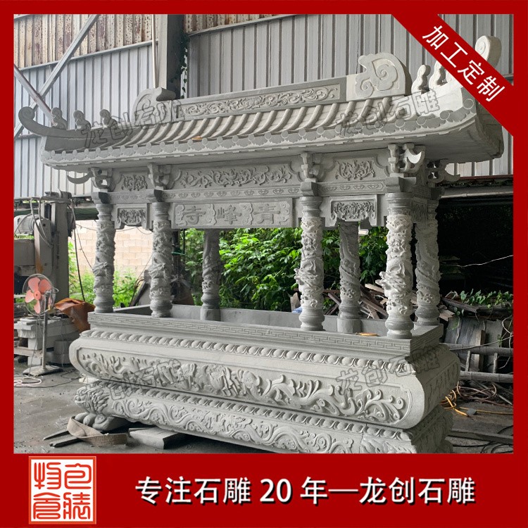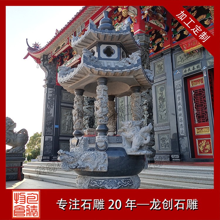 適用場景:青石石雕香爐在寺廟、宗祠等宗教場所中非常常見,其古樸典雅的色調能夠營造出莊重肅穆的氛圍。