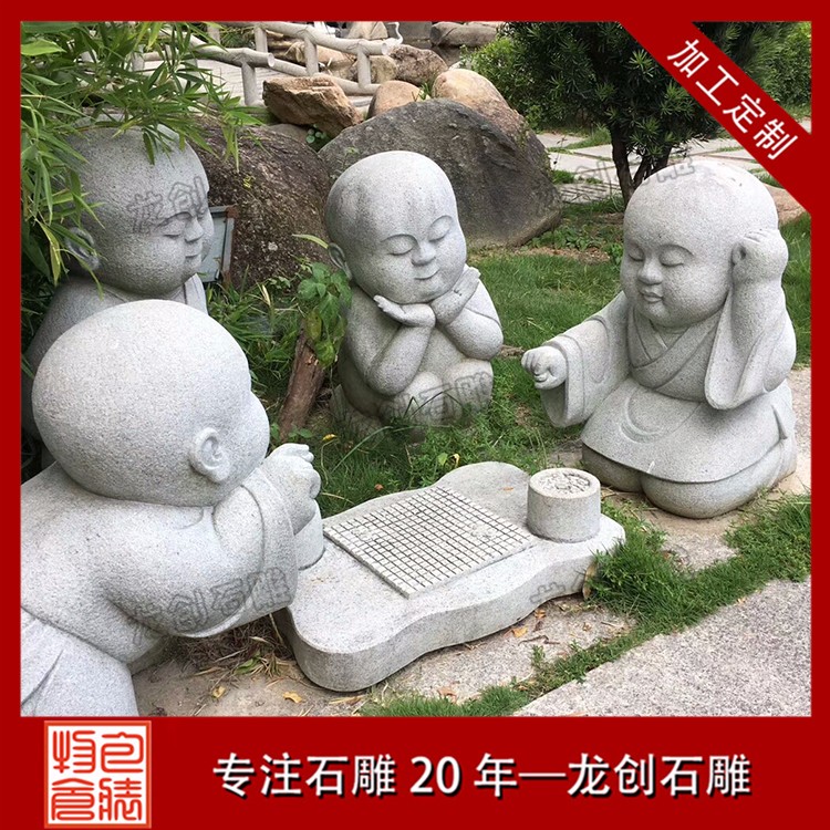 石雕精品小沙彌就是用優(yōu)質(zhì)石材雕刻制作的小和尚造型,一般都是10歲以下的孩童雕塑。由于小孩的天真爛漫,各種各樣有趣的造型都會(huì)做出來(lái),比如下棋的小沙彌,睡姿的小沙彌、嬉戲的以及功夫小沙彌,打掃衛(wèi)生的等等,也有一些修行的小沙彌造型,比如參禪打坐的造型,敲木魚(yú)的造型。石雕小沙彌的百態(tài)千姿是寺廟諸佛菩薩雕塑里面較多的一種,也是讓信眾們發(fā)自?xún)?nèi)心的喜愛(ài)和尊敬的一種佛教弟子塑像。