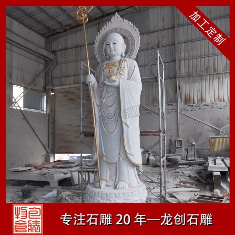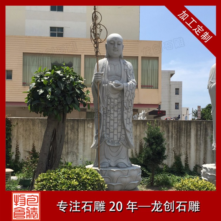 石雕地藏王菩薩圖片形象一般菩薩為頭戴寶冠、身披天衣、瓔珞裝飾的天人相。而地藏菩薩則多為光頭或是頭戴毗盧冠,身披袈裟的出家人之相。一手持錫杖,一手持蓮花,或是手持幡幢、寶珠等。石雕地藏王菩薩價格會根據材質、尺寸和雕刻工藝的變化而變化,具體的價格多少錢,歡迎來電咨詢。