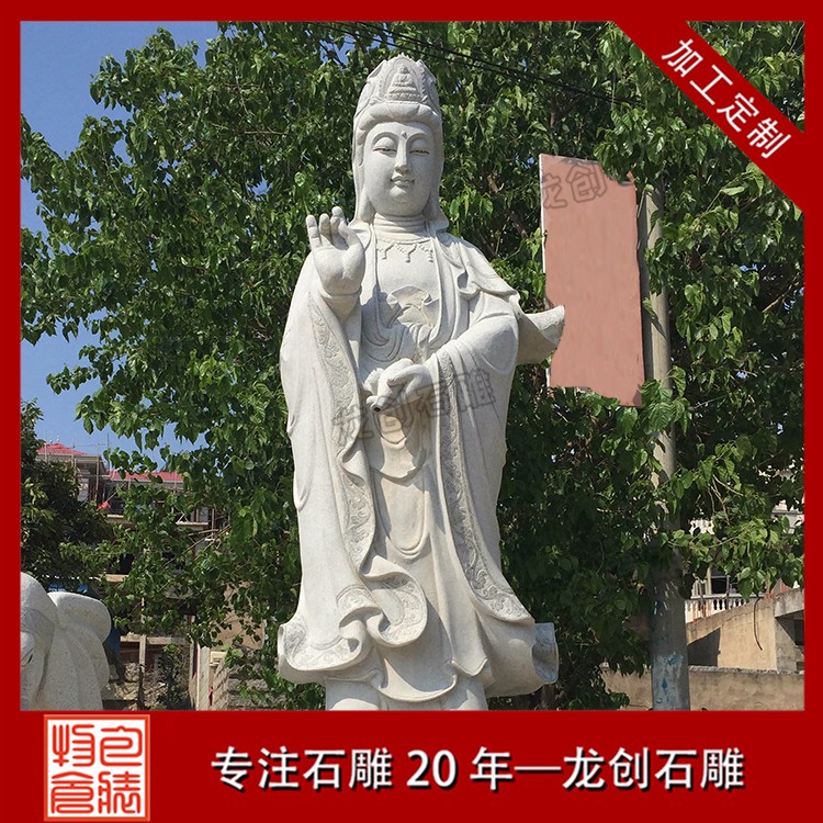 在現(xiàn)代石材市場(chǎng)中,將石材根據(jù)其形成的方式不同區(qū)分為花崗巖、大理石、砂巖等。在滴水觀音佛像雕塑的所用石材中,這三種石材都是可以作為雕塑用材的,但是常用的石材并沒(méi)有很多。以福建石雕滴水觀音佛像為例,目前這里制作滴水觀音的主要石材為部分花崗巖石材和漢白玉。這些所說(shuō)的花崗巖石材有芝麻白花崗巖、芝麻灰花崗巖、青石、桃花紅、泉州白。其中以湖北633#石材制作滴水觀音為美觀,也是價(jià)格相對(duì)較高的。采用這種石材制作出的滴水觀音外表顆粒細(xì)膩,身體紋路清晰自然,遠(yuǎn)處觀看又像是白色雕像,整體制作出來(lái)的石雕滴水觀音十分干凈整潔。