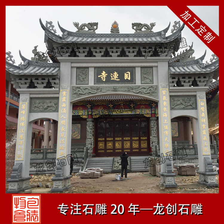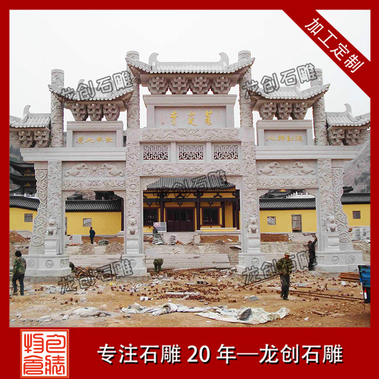 大型石雕山門的應用還挺多的,在新農村、風景區、寺院等地方都開始慢慢地建造大型石雕山門了。大型石雕山門在制作上采用了多樣化的雕刻工藝,雕刻制作出許多細致精湛的圖案,讓其與環境相互輝映,更具樸素質感貼近大自然。