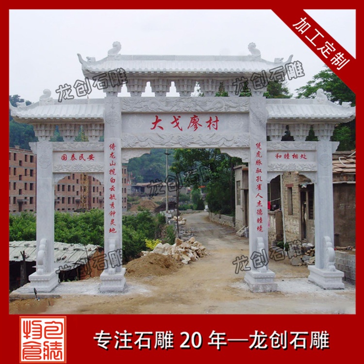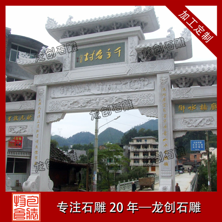 村口石牌坊定制加工浮雕有祥龍、麒麟、吉祥大象等,石獅子位置是石牌坊抱鼓石的位置,在石牌坊主體建筑門前人們不抬頭也可以一眼就看到,不僅很好地映襯和裝飾了進(jìn)村牌坊主體建筑,而且更地塑造了整個(gè)村莊的吉祥文化氣氛。古人生活在一個(gè)易受自然災(zāi)害侵襲和其他不確定因素侵犯的環(huán)境中,需要這種“進(jìn)村石牌坊布局加以保護(hù),進(jìn)村牌坊雕刻具有寧靜、安詳?shù)奶攸c(diǎn)。進(jìn)村牌坊上的守門石獅的設(shè)置正是對這一特征的強(qiáng)化,是古人追求平靜祥和這一心理特征的側(cè)面反映。